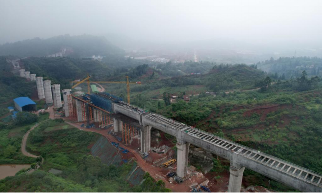 向家坝灌区北总干渠一期一步工程最长的渡槽——大地湾渡槽正在加快建设中(2023年6月16日摄)。新华社记者刘诗平摄