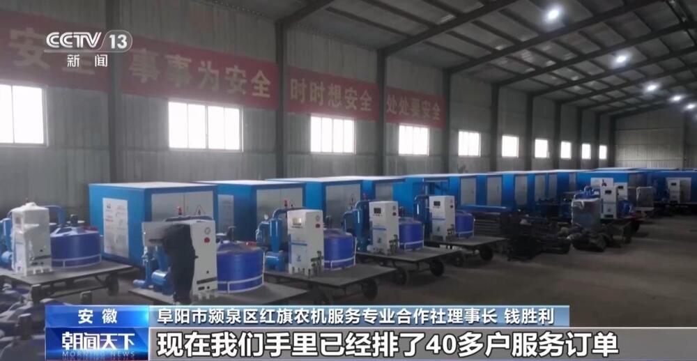 安徽省阜阳市颍泉区红旗农机服务专业合作社理事长 钱胜利:现在我们手里已经排了40多户服务订单,一台水肥一体化服务车每天可以服务200多亩地,省工又省钱,还能显著增产增效。