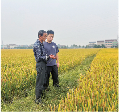 浙江省海宁市周王庙镇农技推广人员正与水稻种植户车家田查看作物长势。