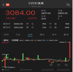 2月24日,国内小麦价格继续猛涨,地方储备小麦拍卖突破1.5。俄乌紧张局势推动国际小麦突破九年半最高水平,也刺激国内市场。郑麦周四涨势强劲,强势上探近5年最高水平3084元/吨,最终封于涨停板。