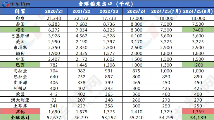 美国农业部8月供需报告偏利多。2024/25年度全球大米供应、消费、贸易和期末库存数据较上月全线下调。其中全球大米供应量减少100万吨至7.044亿吨,主要因为越南和菲律宾的初期库存减少以及越南的产量减少。全球大米消费量小幅下降至5.27亿吨,因为菲律宾、越南和肯尼亚消费减少量大于巴西的消费增加量。全球大米贸易量降至5440万吨,因为巴西和越南的出口减少。预计全球大米期末库存将减少70万吨至1.774亿吨,主要因为越南的库存减少。8月份全球大米供需形势由宽松转向趋紧,或将减缓国际大米价格下跌幅度。