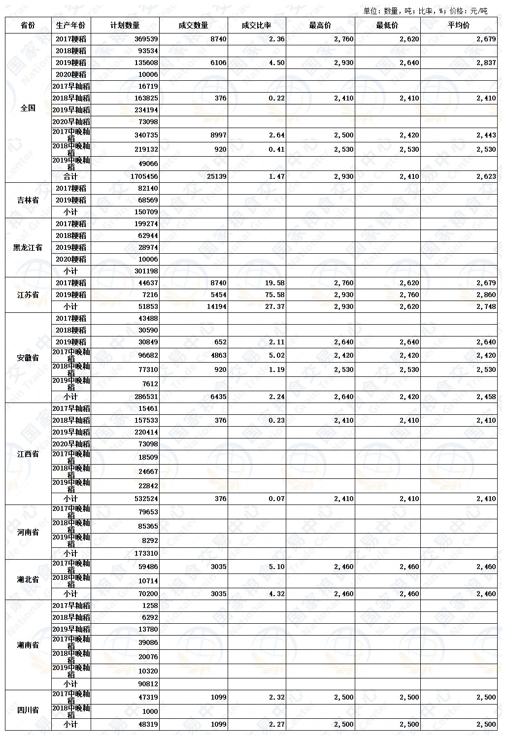 7月9日最低收购价稻谷(2017-2020年)交易结果