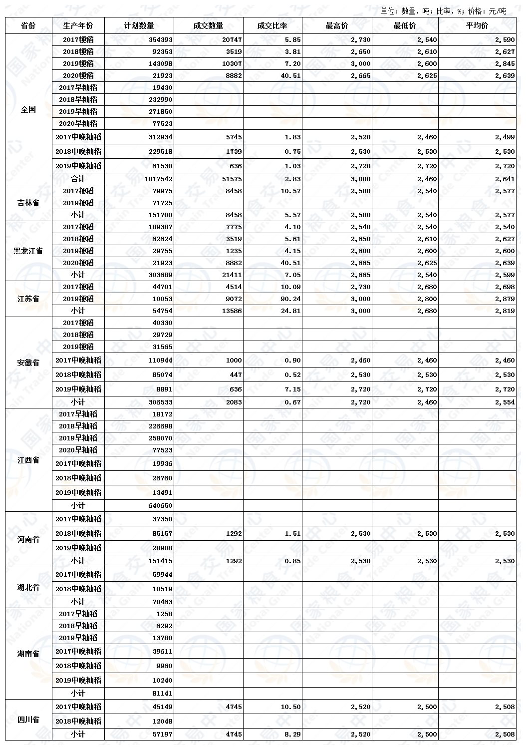 6月11日最低收购价稻谷(2017-2020年)交易结果