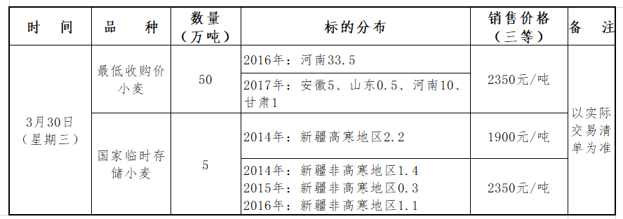 注:销售价格等级价差40元/吨;同一标的混等粮食销售底价,按不同收购等级加权平均后,四舍五入保留到十位(即个位为零);本交易安排为预公告,交易日的实际销售数量以国家粮食交易中心官网发布的交易清单为准。