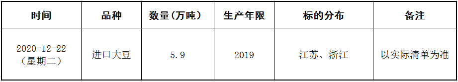 受中储粮油脂有限公司委托,2020年12月22日9:30在国家粮食和物资储备局粮食交易协调中心及联网的各省(区、市)国家粮食交易中心组织开展进口大豆竞价交易,请交易会员通过国家粮食交易中心官网(www.grainmarket.com.cn)登录“国家粮食交易平台→我要买粮→参加竞价交易→中央储备粮轮换交易”参与交易。现就有关事项公告如下(重点提示内容详见加粗字体部分):