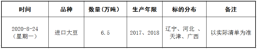 受中储粮油脂有限公司委托,2020年8月24日9:30在国家粮食和物资储备局粮食交易协调中心及联网的各省(区、市)国家粮食交易中心组织开展进口大豆竞价交易,请交易会员通过国家粮食交易中心官网(www.grainmarket.com.cn)登录“国家粮食交易平台→我要买粮→参加竞价交易→中央储备粮轮换交易”参与交易。现就有关事项公告如下(重点提示内容详见加粗字体部分):