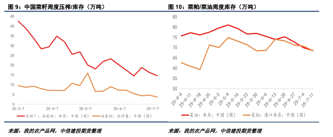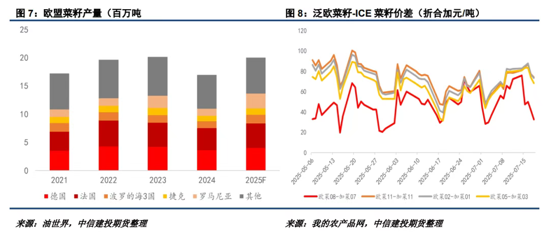 随着时间进入7月底,欧盟新季菜籽基本收获,产量得到确认。据油世界预估,25/26年度欧盟菜籽产量好于预期,达到2000万吨,调增70万吨,同比增产300万吨左右。从季节性来看,三季度欧盟以消化本国新季菜籽为主,对外进口数量料环比下降,这可能导致加菜籽出口同步放缓。从价差水平来看,近月欧菜籽与加菜籽的价差低于远月,侧面反映近端加菜籽可售压力偏低,估值存在支撑。