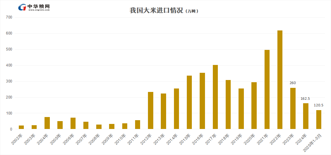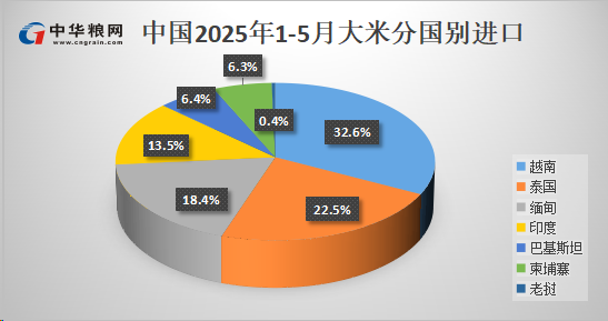 1-5月累计进口量为120.5万吨,同比增加约86.5%。其中从越南进口39.3万吨,占比32.6%;泰国进口27万吨,占比22.5%;缅甸进口22万吨,占比18.4%;印度进口16万吨,占比13.5%。