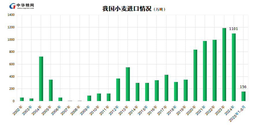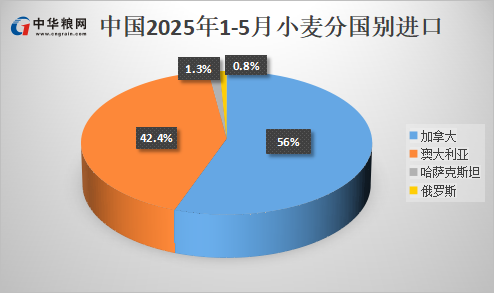 1-5月小麦进口量总计为156万吨,同比减少约80%。进口来源国主要有:从加拿大进口86.3万吨,占比56%;从澳大利亚进口66万吨,占比42.4%;从哈萨克斯坦进口2万吨,占比1.3%;俄罗斯居第四位进口1.2万吨,占比约0.8%。