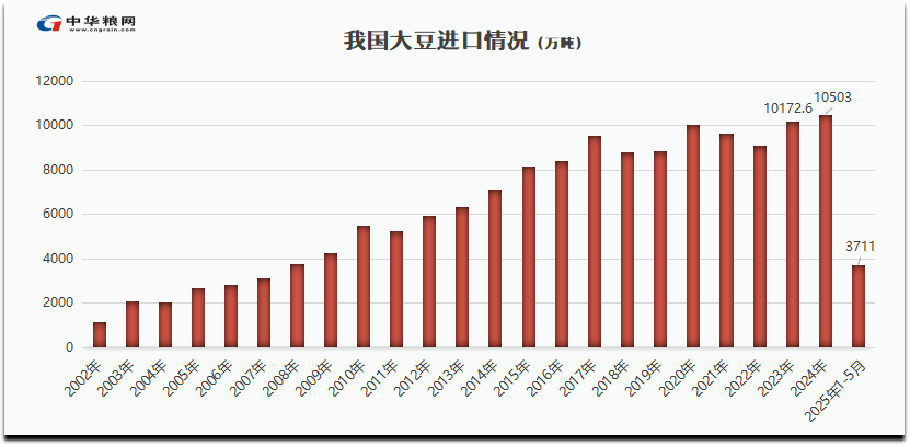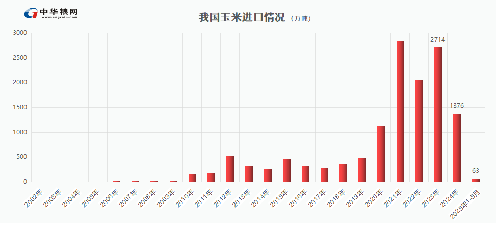 根据海关最新数据,2025年1-5月我国累计进口粮食进口量为4837万吨,同比减少29.7%;进口金额为1464.7亿元人民币,较去年同期减少30.1%。