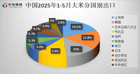 1-5月,我国稻米累计出口量53万吨。其中,向土耳其出口7.5万吨,占比14.1%;向韩国出口6.8万吨,占比12.8%。