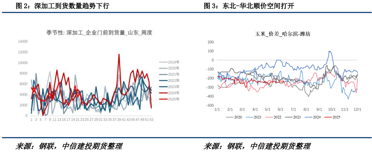 作为交叉验证,山东深加工到货的数量一方面趋势性减少,且结构环比趋于东北粮为主的格局,近两周山东工厂到货中东北粮占比从50%提升到85%,也反映出华北余粮相对偏少的情况;另一方面,东北和华北顺价的情况仍在持续。