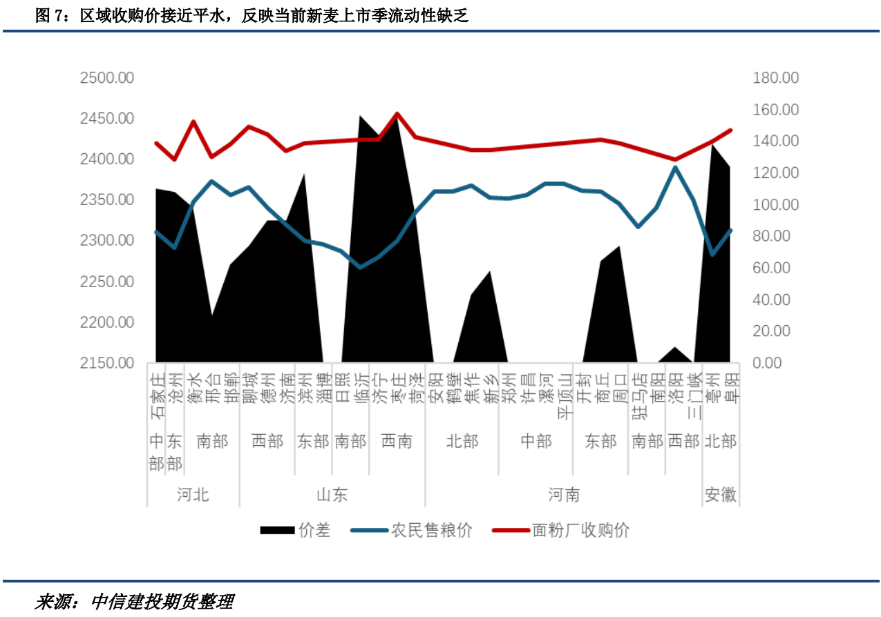 其次,需求偏弱以及锚定效应也限制了区域间的流通。今年粮点和面粉厂收购价复刻去年区域间平水的格局,且以最低保护价为收购锚定。一方面是需求偏弱的环境下,面粉厂收购的积极性不高,甚至部分中小面粉厂和粮点收购价保持一致;另一方面面粉厂不涨价粮点也不敢提价收购。后期需要看到更为积极的外力作用。