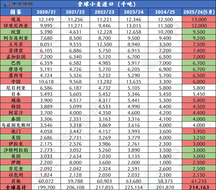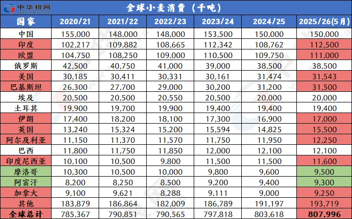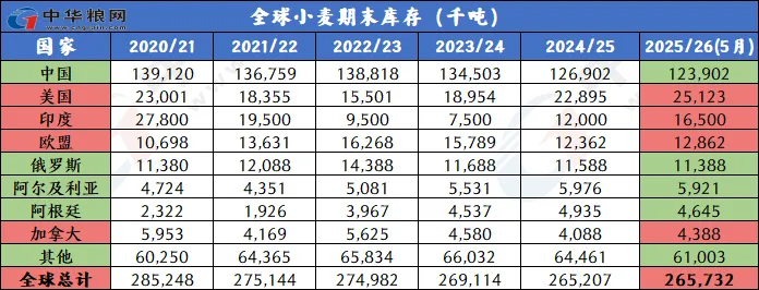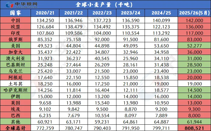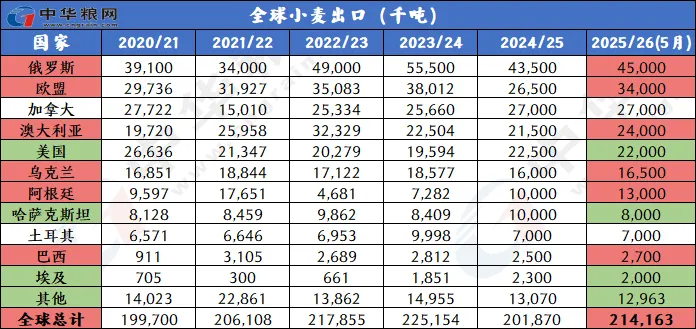 美国农业部5月小麦供需报告整体偏空。报告显示,2025/26年的全球小麦前景是供应增加,消费和贸易增加,库存略有增加。预计供应量将增加490万吨达到10.737亿吨,全球小麦产量预计将达到创纪录的8.085亿吨,主要因欧盟、印度、中国、英国、阿根廷等主产国产量增加。消费量将增加440万吨,达到创纪录的8.08亿吨,因为食品、种子和工业(FSI)使用量预计将继续增长。全球贸易量为2.13亿吨,比去年增加690万吨,但远低于2023/24年创下的2.222亿吨的纪录。欧盟将是主要出口国,其出口增加750万吨,达到3400万吨;预计俄罗斯仍将是2025/26年全球主要小麦出口国,出口量为4500万吨,高于2024/25年的4350万吨。全球期末库存为2.657亿吨,比去年增加50万吨。主要因中国和巴基斯坦的降幅较大,印度、美国、欧盟增幅最大。供需报告对行情影响偏空,当天美小麦主力合约下跌1.39%,收514.5美分每蒲。