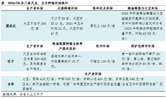 除此之外,今年东北三省大豆、玉米种植补贴政策亦会影响玉米种植面积。从部分地区已经公布的信息来看,黑龙江、辽宁大豆、玉米轮作种植补贴力度相当,大豆生产者补贴力度以辽宁最具优势。通过调研了解,市场业者普遍反映,黑龙江大豆补贴对玉米种植面积影响较明显,今年玉米种植面积或略减,辽宁、吉林影响或有限。(备注:具体补贴标准以省文件为准)