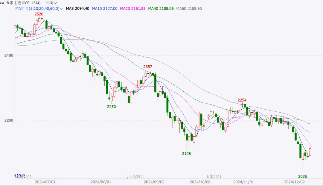 近期玉米盘面波动比较大,各合约探底回升。玉米2501合约,12月5日上午最低跌至2035元,随着政策信号的再度增强,快速反弹。本周二小幅反弹上涨,收盘于2113元,也是近期首次站上五日均线。玉米2505合约近期探底回升,上周最低跌至2120元,本周二小幅上涨,收盘于2215元,与3日收盘价持平。