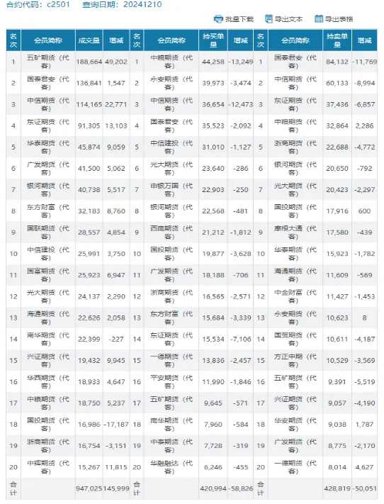 总体看12月10日C2501合约持仓减少79878手至59.8万手,资金流出2.12亿元至17.71亿元。主力合约正在进行转换中,C2505合约当日持仓增加30370手至60.9万手,资金净流入1.18亿至18.9亿元。无论是持仓还是资金,C2505已经超过C2501合约。