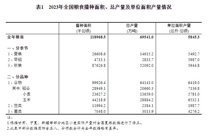 三、全国粮食总产量69541万吨(13908亿斤),比2022年增加888万吨(178亿斤),增长1.3%。其中谷物产量64143万吨(12829亿斤),比2022年增加819万吨(164亿斤),增长1.3%。