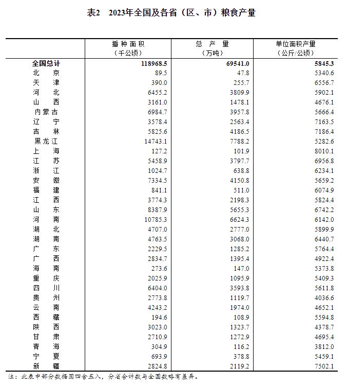 根据对全国31个省(区、市)的调查,2023年全国粮食播种面积、单位面积产量和总产量分别如下: