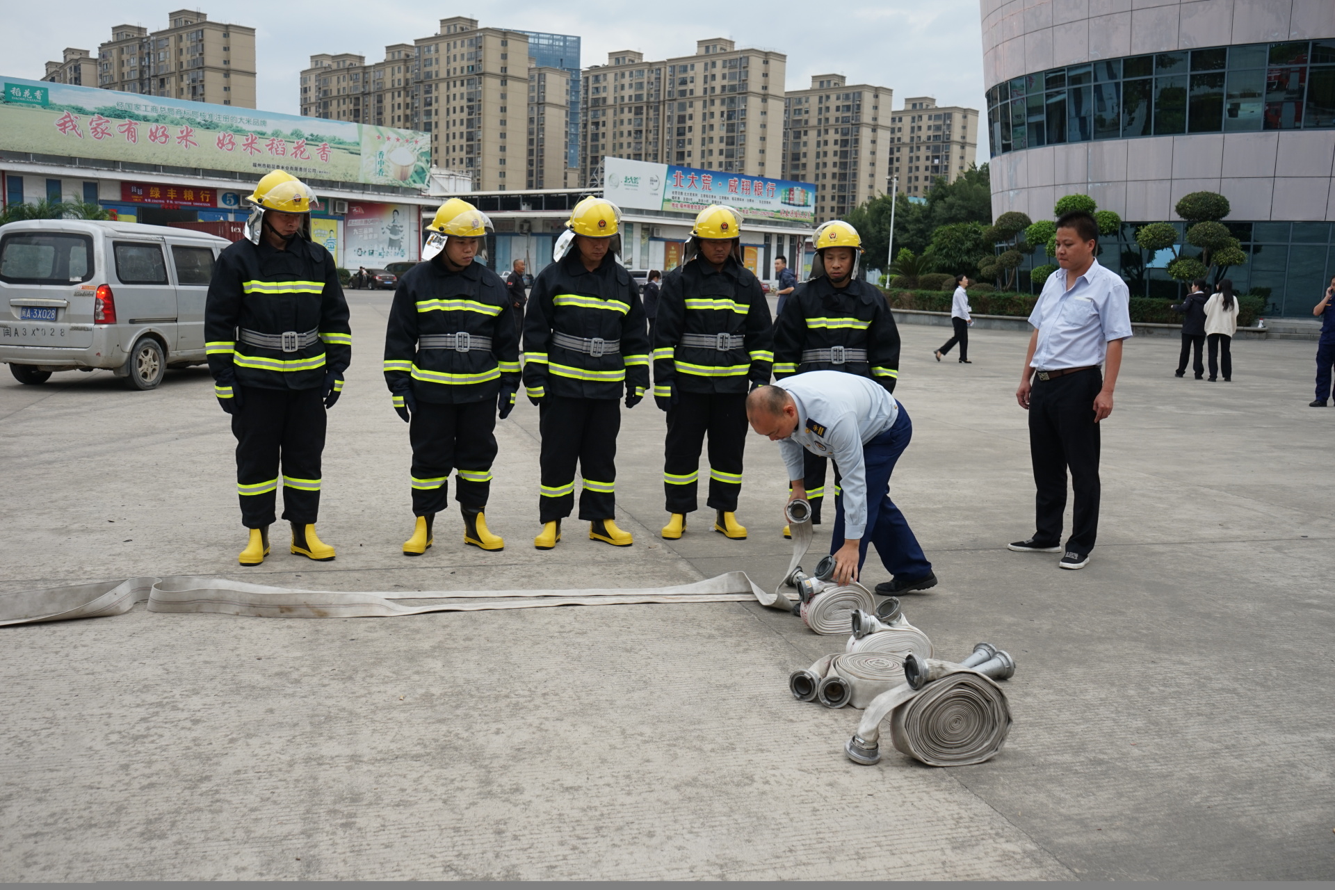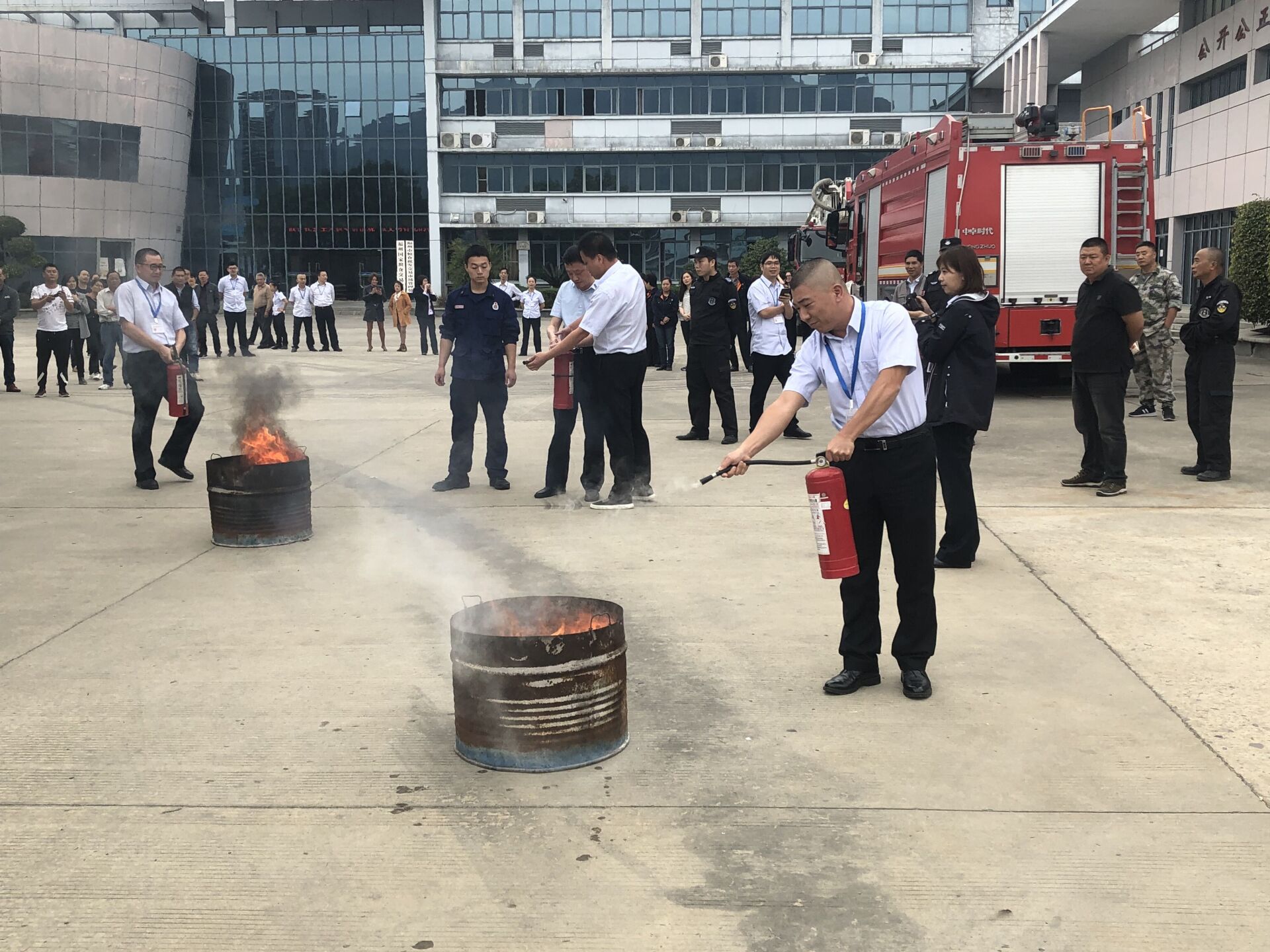 三、消防安全演练。现场一部登高车、一部多功能水罐车,10名消防官兵与我市场领导、职工、义务消防队员参加演练。此次演练的主要内容包括如何正确使用消防器材和操作技术规范、密集型场所人员如何疏散、自救、逃生。