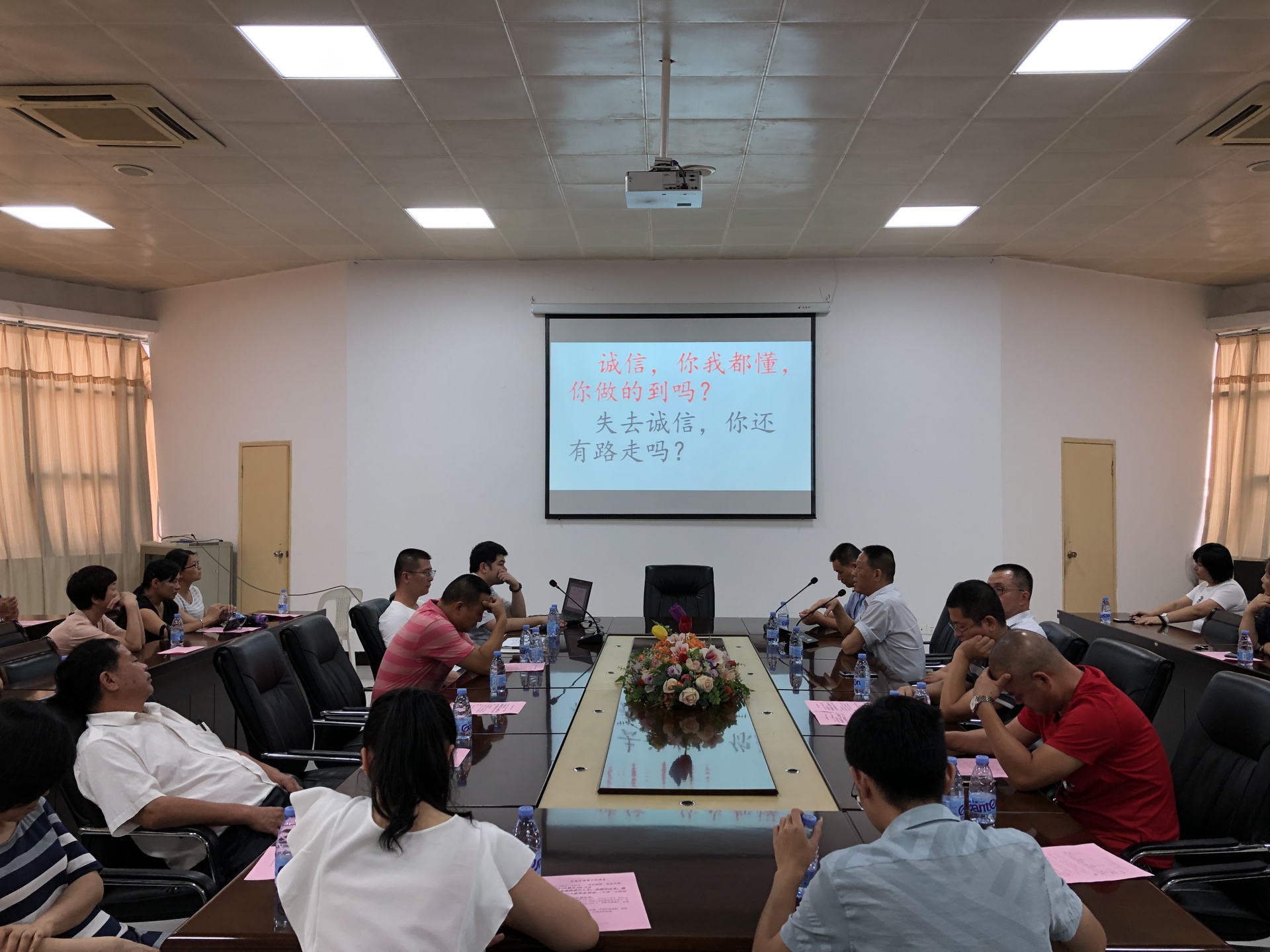 会上闽侯县市场监管所荆溪所潘少连所长就食品安全的各项工作进行了宣传,并通报了日常检查中存在的问题,要求各企业认真检查对照。一是经营企业不得在店内随意进行预包装生产;二是及时对所经营的产品在“福建省食品追溯管理系统”中更新到位;三是要求各生产经营企业所有员工积极参与扫黑除恶这场人民战争中,举报违法的黑恶势力,打击菜霸、市霸、行霸,扫除黑恶势力,营造健康、有秩序的市场经营环境。我处市场管理科制作了宣传PPT,从六个方面进行宣传“粮食诚信经营”的重要性,实现诚信经营关系到企业的长远利益,关系到企业的生死存亡,关系到市场经济的兴衰。我们围绕以下六个方面进行宣传教育:一是诚信及诚信经营的内涵;二是诚信经营能给企业带来经济效应;三是诚信经营的优势以及失信带来的危害;四是诚信经济的优势;五是企业不进行诚信经营所带来的危害;六是实现诚信经营的策略。希望大家共同承诺信守诚信,流失了诚信,无异于流失了优良传统,也流失了做人的良知与自尊。