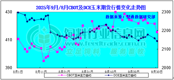 图表:2025年9月/8月CBOT玉米及DCE玉米期货市场行情变化走势图(单位:美分/蒲式耳,元/吨)