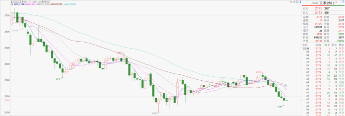 国内玉米主力C2511合约继续回落,再创新低。当周开盘2190元,盘中最高2195元/吨,最低2147元/吨,收盘于2175元/吨,较上周下跌17元,跌幅0.78%;为连续第五周回落。周五夜盘停收2174元。