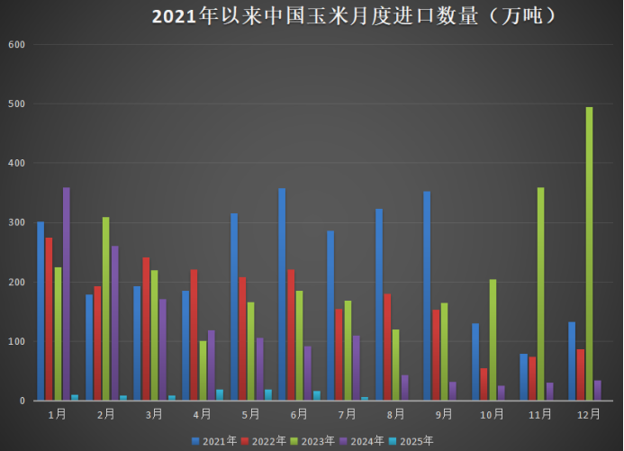 根据海关的数据显示,7月份中国玉米进口数量为5.58万吨,同比去年同期的109万,锐减94.9%;比6月的16万吨,减少64.32%。1-7月份合计进口玉米84万吨,同比下滑93%,不及去年同期单月最低数值。