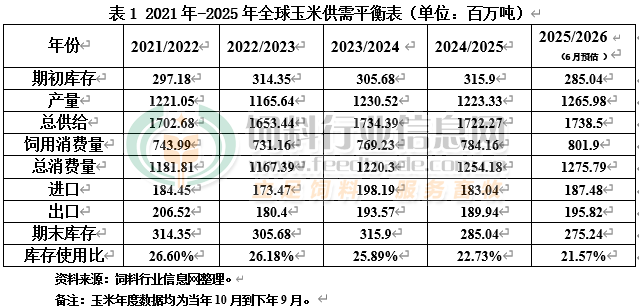2025年6月12日美国农业部发布供需报告,对2024/25年度美国玉米出口提高,期末库存预测继续下调;2025/26年度美国玉米供需预测值与上月相比变化不大,期初和期末库存均有所下调。其中预计2024/2025年度美国陈季玉米出口目标从26亿蒲上调至26.50亿蒲,增加5000万蒲,期末库存相应从14.15亿蒲下调至13.65亿蒲。2025/2026年度美玉米种植面积为9530万英亩,较2024/25年度增加5.2%;2025/2026年度美玉米收获面积8740万英亩,同比增加5.4%;2025/2026年度美玉米单产181.0蒲式耳/英亩,同比提升0.9%;2025/2026年度美玉米产量158.2亿蒲式耳,同比增长6.4%。2025/2026年度美玉米饲用消费59.0亿蒲式耳,同比增加2.6%;2025/2026年度美玉米用于乙醇生产的玉米用量为55.0亿蒲式耳,同比持平;2025/2026年度美玉米出口预期26.75亿蒲式耳,同比增长2.9%;由于期初库存调低5000万蒲,2025/2026年度美玉米期末库存相应调低到17.5亿蒲,低于5月份预测的18亿蒲;2025/2026年度美玉米库存用量费比预计为11.6%,同比提高9.0%。