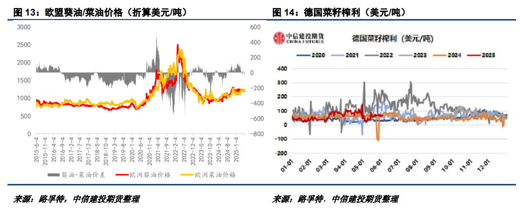 价格涨幅差异导致25/26年度葵籽、菜籽扩产程度分化。油世界预估25/26年度全球产量增加500-600万吨至6060万吨,其中俄罗斯和乌克兰各增加190万吨,欧盟增加140万吨。目前而言欧盟的增产基本兑现,俄乌还需要关注6-7月的降雨情况,但增产趋势较难扭转。菜籽方面,欧盟同比增产250万吨,俄罗斯有望增产50万吨,但乌克兰和澳大利亚分别受到霜冻和干旱的干扰,产量可能下降,加拿大方面还有不确定性,总体增产不如葵籽。