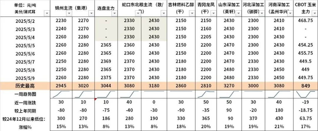 现货市场方面,截至2025年5月9日(第18周)全国玉米均价2352元/吨,周比上涨52元/吨。