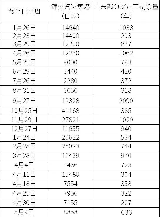 截至5月9日当周,按照北港二等玉米平舱2300-2320元/吨,大船运费55元/吨,港杂等费用45元/吨推算,理论散船到港成本2400-2420元/吨。当周周末,南方散船二等玉米报价2350-2370元/吨,即期理论亏损50元/吨;北方新季玉米集港量(汽运)到货量、山东深加工企业门前玉米到货量略有增加,参见下表。