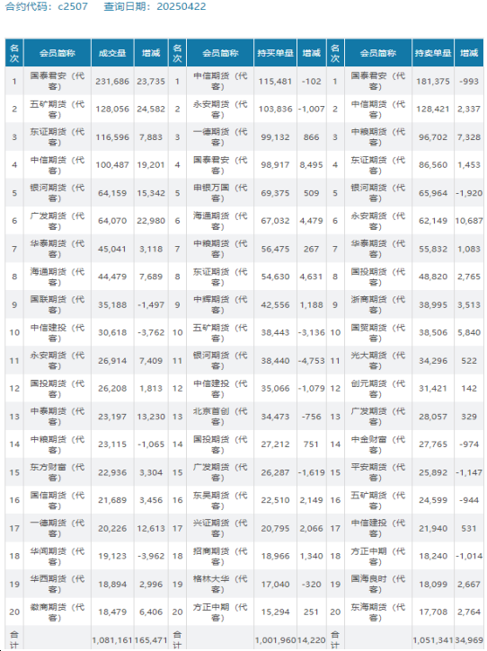 从持仓报告看,C2507 合约当日成交量108万手,较前一日增加16.5万手,多头主力增仓14220手,空头主力增仓34969手。尽管资金大量流入,但空头主力持仓增幅显著,显示偏空力量占据优势,盘面上涨动能或减弱,不排除止涨回落风险。