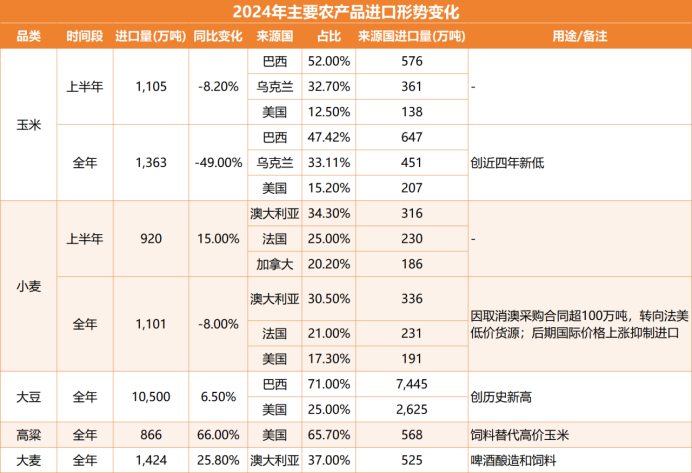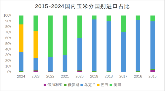 从上面的数据我们不难看出,在2024年我们从美国进口的谷物主要涉及大豆、玉米、小麦、高粱这四个品种,总量大致为3591万吨,去除大豆之外的谷物总量大致为966万吨。回顾历史从2023年开始国内对于美国农产品的依赖度就开始呈现出下滑的态势,以玉米为例从2023年开始国内进口玉米当中美玉米的所占份额已经开始呈现出大幅削减的态势,取而代之的巴西以及乌克兰玉米,客观上也反映出了美农产品对于国内玉米的影响力正在逐步下滑,尤其是像CBOT盘面与国内玉米期货市场的联动性已经呈现出逐步脱钩的态势。