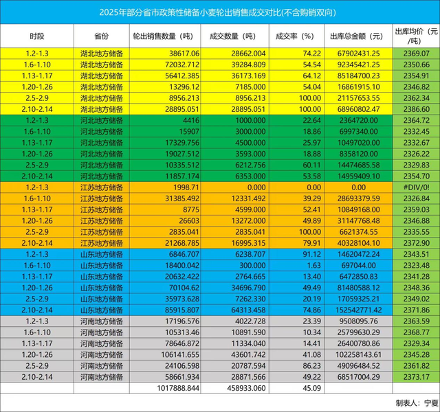 从上方的中央储备粮小麦的竞价交易成交情况对比统计图表上,我们可以明确的看出,春节后单向轮出销售和购销双向交易的成交率都开始有了较大幅度的回升,但单向采购的成交率却是持续下滑的,这个成交率的一升一降所指向的意义非常重要,意味着包括用粮企业在内的小麦市场主体开始认可小麦当前这个价位属于底部区域,不仅敢于出手拿粮,对自有头寸的锁仓意愿也愈发强烈。那么接下来小麦市场价格出现上涨其实是没什么疑问的,只是上涨幅度和持续时间的问题了。同时从部分省市政策性储备小麦轮出销售的成交情况对比统计图表来看,不仅成交率较之前有了大幅度的提升,且整体成交均价是属于多区域全面上涨格局的。