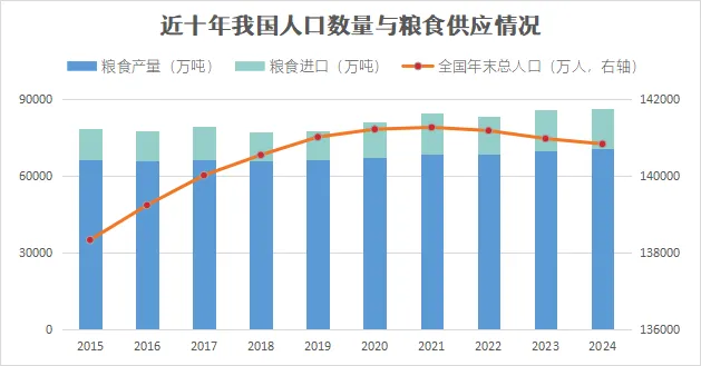 2015-2024年十年间,我国人口增速放缓,粮食供应继续提高。十年间总体粮食供应(粮食产量+进口量)为86402万吨,较前十年增加7865万吨,增幅为9.1%,而人口增幅约为1.8%。这表明粮食供应的增长速度远超人口增长速度,反映了人均粮食占有量显著提高,粮食安全基础进一步巩固。