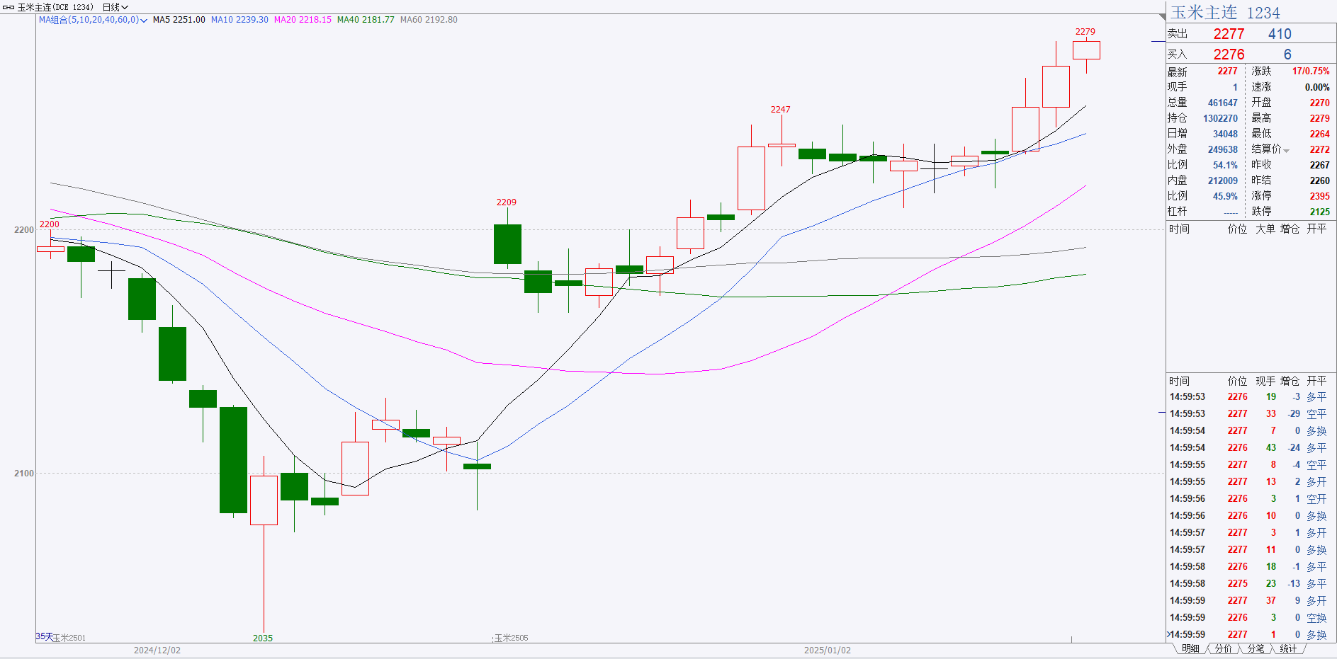 期货方面,周二大连玉米多数合约收红,主力合约增仓上行。截止15:00,玉米主力C2505合约收盘于2277元/吨,比前一日结算价上涨17元,较上周二收盘价大幅提升52元。