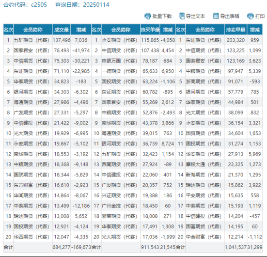 总体看1月14日C2505合约持仓总量增加34048手至130万余手,资金流入1.26亿元至41.52亿元,创下近期最高数值。