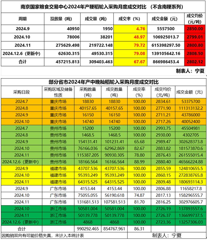 从以上两张月度成交统计图表上,我们可以明确看到南京国家粮食交易中11月份开始粳稻采购进入了高潮区,成交价稳中上涨并有逐步抬高的势头,进入12月份后粳稻采购数量并未出现大幅下降的趋势,成交均价依然坚挺向上,因此短期来说对粳稻市场依然会有明显的支撑,但考虑到成交率的持续高位,说明市场主体惜售情绪有所下降,那么这种对市场价格的支撑作用能坚持多久也是个疑问,因此就粳稻市场而言,从价格位置和形成利润两个角度考虑,笔者依然坚持落袋为安或许是个好的策略。