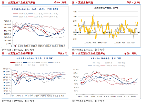 11月生猪价格以下跌为主,其中外三元生猪由月初17.31元/公斤降至月底的16.48元/公斤。虽然养殖户对春节前行情仍存在上涨预期,局地养殖户或猪场开始抢跑春节前市场。据农业农村部最新数据显示,当前屠宰场宰后均重呈现环比下降趋势,暗示市场加大生猪出栏量,供应增量导致猪价持续承压。生猪养殖利润持续收缩,自繁自养利润由465.5元/头降至367.09元/头,外购仔猪养殖利润由112.82增加至142.59元/头。2024年10月末,全国能繁母猪存栏量4073万头,比上个月增加11万头,环比上涨0.3%,连续2个月环比上涨,为近10个月最高存栏量,也就是今年以来最高存栏量,本年度4-10月能繁母猪基本连续6个月环比增加。钢联数据显示,2-10月能繁母猪存栏连续9个月环比增加至约500.6万头。按照10个月的出栏周期,意味着从今年12月至明年8月,生猪存栏稳步增长,且无论从仔猪增量还是从中大猪存栏来看,四季度生猪供应压力增加可以说是板上钉钉,或一定程度上提振饲料需求。目前,饲料企业原料玉米库存由月初的27.94天升至29.21天,处于近年低位,后续存在补库需求,同时考虑替代品谷物四季度退出,有利于提振玉米需求。