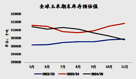 回顾USDA的月度供需数据,其对于全球玉米市场的预估呈现逐步收敛态势,即全球玉米的期末库存呈现不断下修的态势。USDA11月报告中预估2024/2025年度全球玉米期末库存为3.04亿吨,比上月预估值下修2382万吨,比初始预估值下修8126万吨。