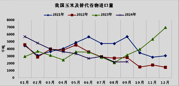 伴随着国内玉米丰收,玉米市场也从产不足需向供需有余转变,国内玉米价格大幅下挫,国内外饲用谷物价差逐渐缩小,进口谷物数量呈明显走低趋势。2024年10月,国内外玉米价差降至300元/吨以下,同比大幅下跌,预计新年度玉米及替代谷物进口量继续减少。
