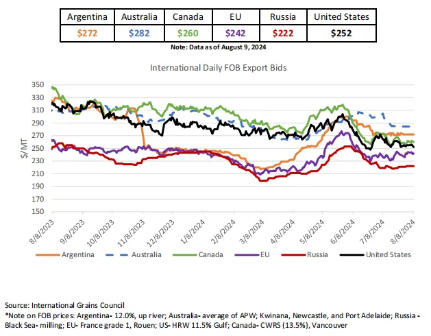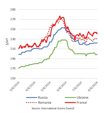 全球:自7月WASDE以来,全球出口商的报价涨跌互现,因为许多主要出口商的生产担忧被疲软的国际需求所平衡。由于来自北半球和黑海的竞争加剧以及中国需求低,澳大利亚的报价下跌了16美元/吨。尽管阿尔伯塔省和萨斯喀彻温省的春小麦状况评级较低,但加拿大的报价下跌了13美元/吨,预计来自美国硬红春小麦的竞争将十分激烈。随着收获压力的增加,美国报价下跌12美元/吨。阿根廷的报价仅下跌了1美元/吨,种植几乎完成。与此同时,尽管各种来源的产量预测良好,但俄罗斯的报价因农民销售疲软而上涨了3美元/吨。欧盟报价上涨7美元/吨,法国的生产和质量问题持续存在。法国农业部表示,普通小麦收成已完成67%(前一年为86%)和硬粒麦收获完成88%(前一年为100%)。