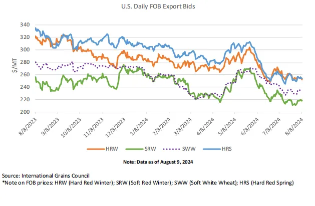 国内(美国):自7月WASDE报告发布以来,美国所有类别的小麦报价都有所下降,反映了冬小麦收成带来的持续压力和NASS 7月产量预测所指出的极为有利的春小麦生产前景。软红冬(SRW)下跌11美元/吨,至218美元/吨,随着冬小麦收成达到88%,硬红冬(HRW)价格下跌12美元/吨,至252美元/吨。硬红春(HRS)下跌6美元/吨,至254美元/吨,小麦质量委员会在北达科他州的作物考察产生了创纪录的单产结果,证实了NASS 7月份的产量预测。软白冬(SWW)仅下跌2美元/吨,至236美元/吨。