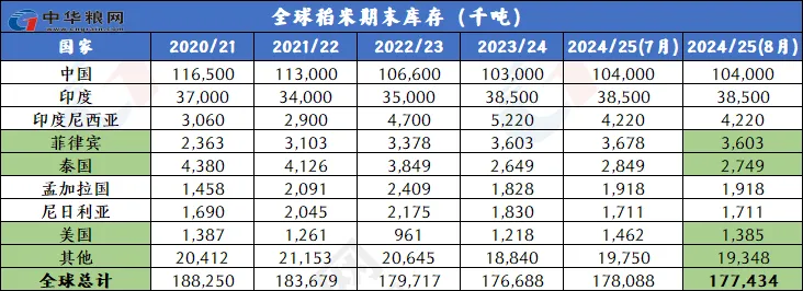 美国农业部8月供需报告偏利多。2024/25年度全球大米供应、消费、贸易和期末库存数据较上月全线下调。其中全球大米供应量减少100万吨至7.044亿吨,主要因为越南和菲律宾的初期库存减少以及越南的产量减少。全球大米消费量小幅下降至5.27亿吨,因为菲律宾、越南和肯尼亚消费减少量大于巴西的消费增加量。全球大米贸易量降至5440万吨,因为巴西和越南的出口减少。预计全球大米期末库存将减少70万吨至1.774亿吨,主要因为越南的库存减少。8月份全球大米供需形势由宽松转向趋紧,或将减缓国际大米价格下跌幅度。