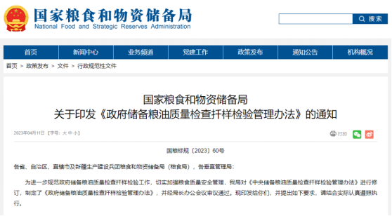 4月11日,国家粮食和资储备局发布《政府储备粮油质量检查扦样检验管理办法》的通知,旨在进一步规范政府储备粮油质量检查扦样检验工作,切实加强粮食质量安全管理。