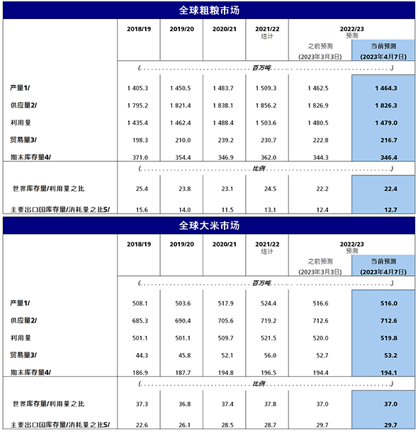 粮农组织2023年季末世界谷物库存量预报数上调580万吨,至8.5亿吨,但仍较期初水平下降0.3%。根据最新的预报数,2022/23年度世界谷物库存量与消费量之比为29.7%,尽管略低于2021/22年度的30.7%,但总体水平仍然适宜。全球粗粮库存量本月调增220万吨,但预计仍将较期初水平减少4.3%。由于阿根廷和美国的出口前景调低以及乌克兰的估计产量调高,主要玉米出口国的库存量预计将有所增加,是本月调增的主要原因。全球小麦库存量预报数本月亦获上调,390万吨的上调幅度进一步推动较期初水平的预期增幅增至5.3%。与粗粮情况类似,本月小麦库存量上调也集中在主要出口国,包括澳大利亚(估计产量增加)、欧盟(官方差额修正)和俄罗斯(出口预期下降)。2022/23销售年度季末的世界大米库存量预报数为1.941亿吨,较2021/22年度创下的最高纪录低240万吨。这一水平足以满足4.4个月的预期全球消费量,这主要是由于亚洲储备的前景仍接近创纪录水平,即归功于印度的预期库存恢复。其他地区的库存结转前景则更为黯淡。拉丁美洲及加勒比地区以及非洲的情况尤其突出,部分原因是南美和东非减产,但也源于加纳、埃塞俄比亚和塞内加尔等国的进口前景有所下降。
