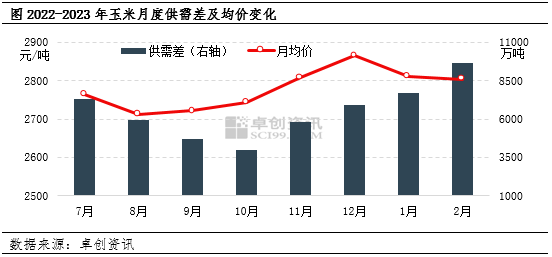 所以2月玉米市场供大于求格局延续,供需差较1月扩大25.47%,拖累玉米月均价环比1月下跌0.32%。