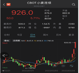 CBOT小麦近三天是连续三级跳,22-24日分别单日上涨5.8%、3.58%、5.89%,短短三天就从不足800美分,上涨至926美分/蒲式耳,涨幅达到16.7%。