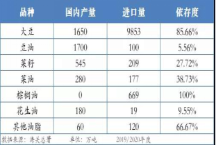 2020年我国进口食用植物油983万吨,占到国内消费量的三成左右。油料中最重要的两个品种是花生和油菜籽。其中,菜油进口依赖程度在40%左右,花生则相对自给自足,供需偏紧年份进口相对偏多,而棕榈油完全依赖进口。